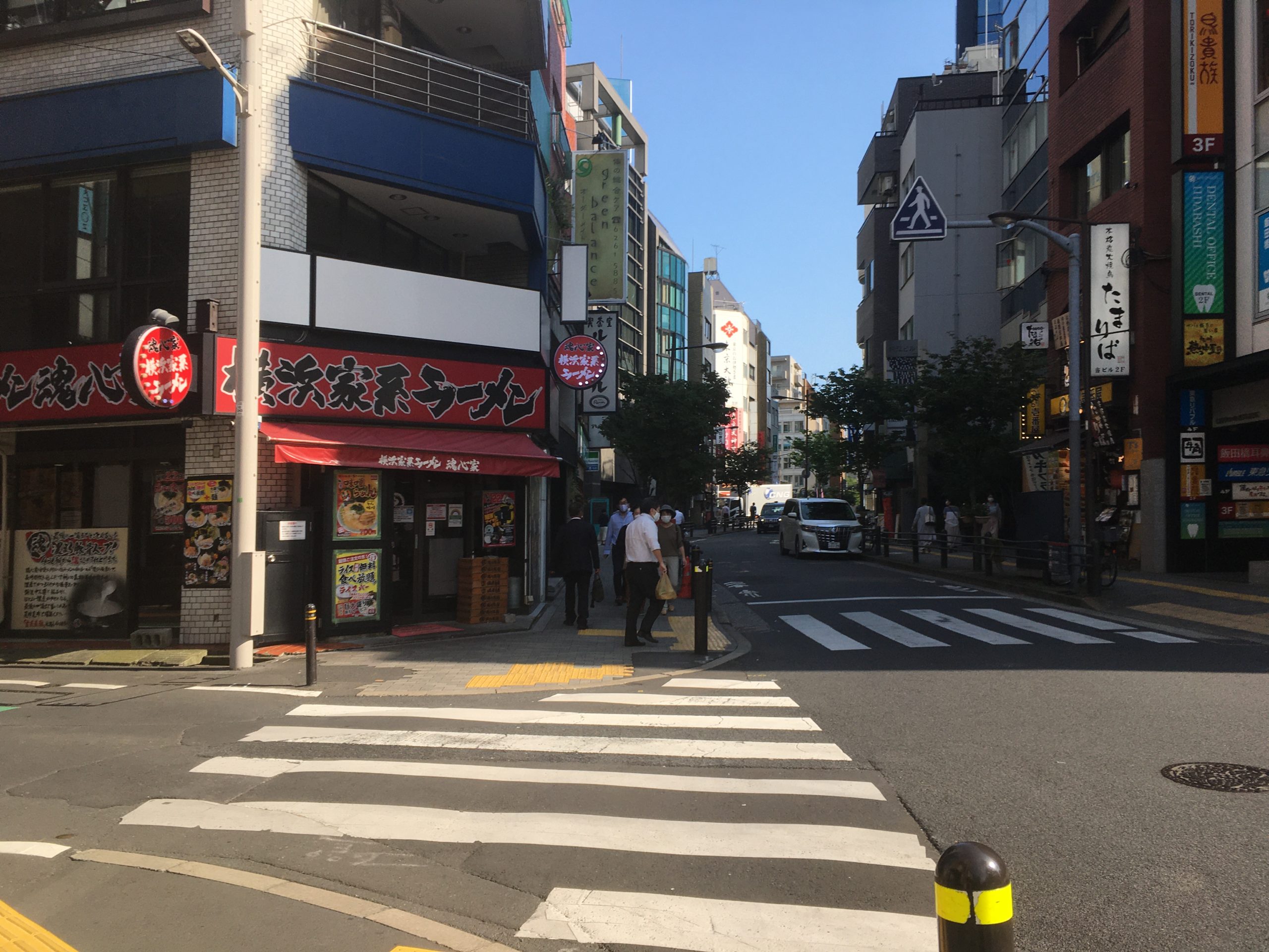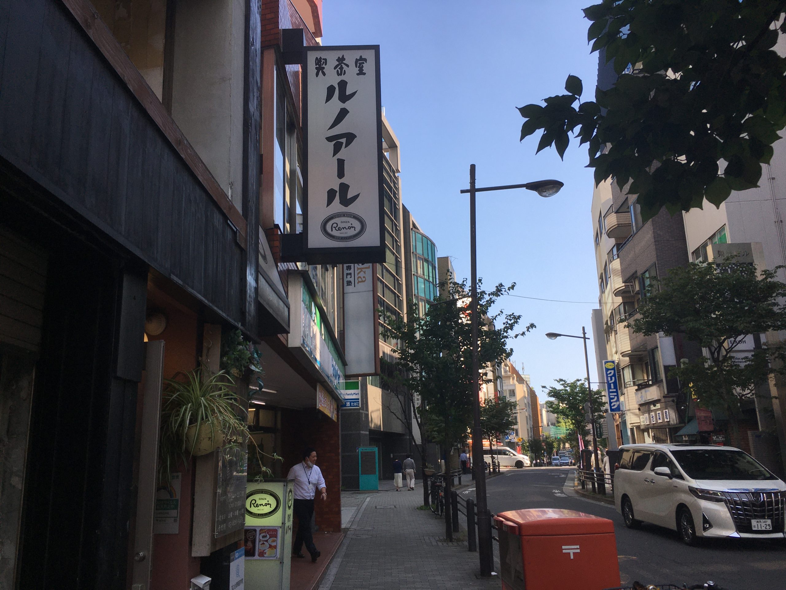 交差点を渡って直進するとすぐに、左手に1階がファミリーマート・2階が喫茶室ルノアールのビルが見えます。
